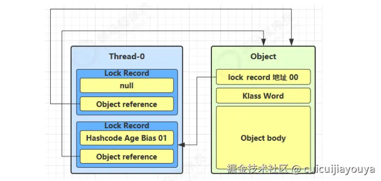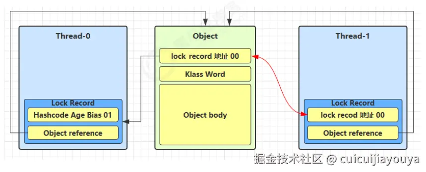 当 Thread-1 进行轻量级加锁时,Thread-0 已经对该对象加了轻量级锁