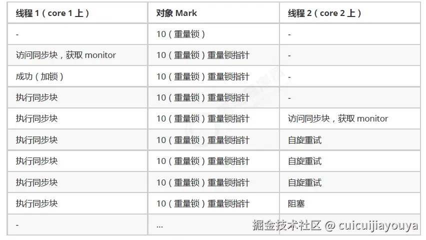 重量级锁竞争时,尝试获取锁的线程不会立即阻塞,可以使用自旋(默认 10 次)来进行优化,采用循环的方式去尝试获取锁