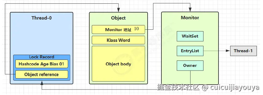 其内部包含一个计数器,当计数器为0则可以成功获取,获取后将锁计数器设为1也就是加1。相应的在执行 monitorexit 指令后,将锁计数器设为0,表明锁被释放。如果获取对象锁失败,那当前线程就要阻塞等待,直到锁被另外一个线程释放为止