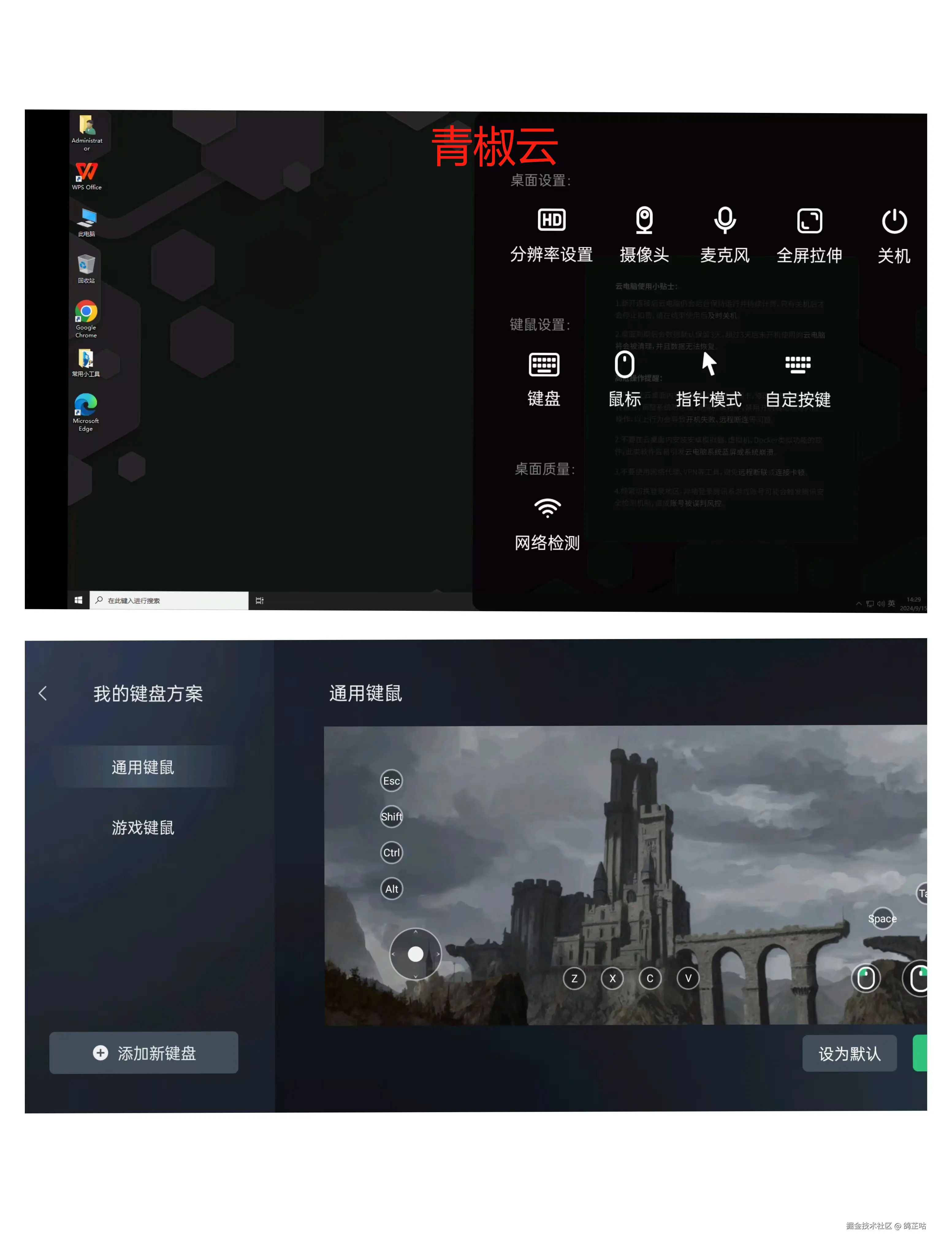 - 青椒云:移动端的体验甚至还不如易腾云,且不说我专门开了一台游戏娱乐的云电脑,一进来却连游戏得没给我预装。在按键方面也只有两种选择,手机端玩游戏不仅需要自己下载还需要自己去调按键,这体验实在是太差了。