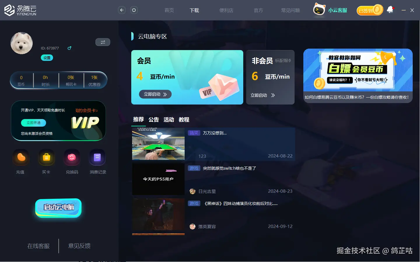易腾云采用了分钟计费的方式,之前还可以白嫖下签到豆币,现在会员用户每小时的费用为4.8元至5.4元不等,非会员用户则为5.4元至7.2元。这个价格相对是比较高的了,特别是对于高频使用者来说,费用方面是一个很大的考虑因素。