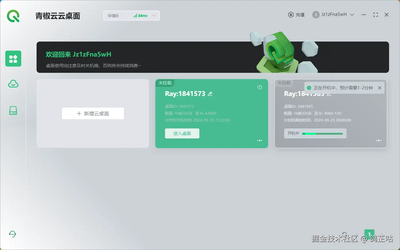 - 在开机时ToDesk云电脑几乎是秒开秒进几乎没有停顿,青椒云这边实际体验却需要连开机都需要等待俩分钟