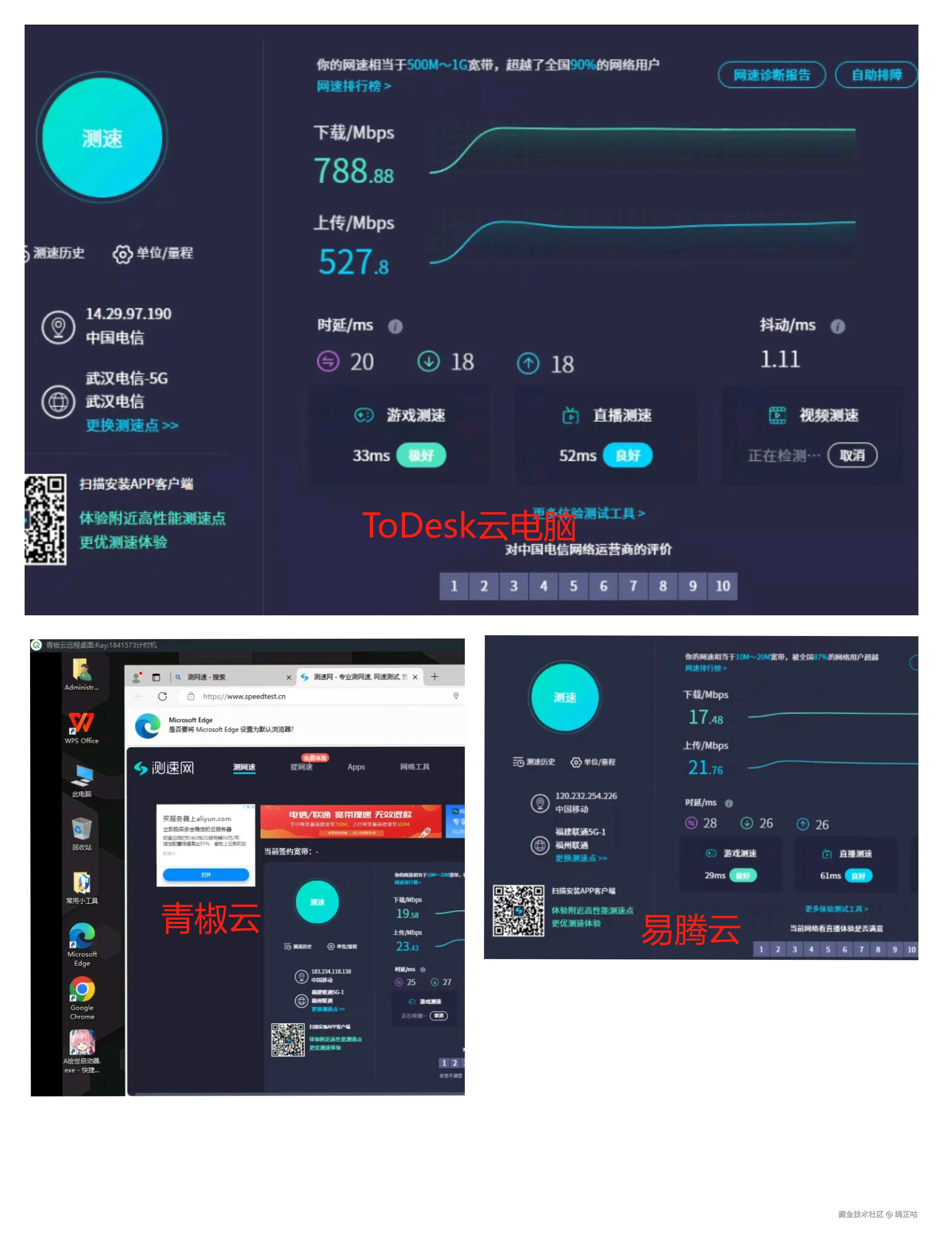 测试下来也是吓了我们一跳啊,ToDesk云电脑测试速度居然达到了788Mbps,上传速度也达到了527Mbps,而青椒云和易腾云居然才20M左右的速度, ToDesk云电脑遥遥领先一大步,很多可能觉得数据不真实,但是别急我们实际下一款游戏来测试下。