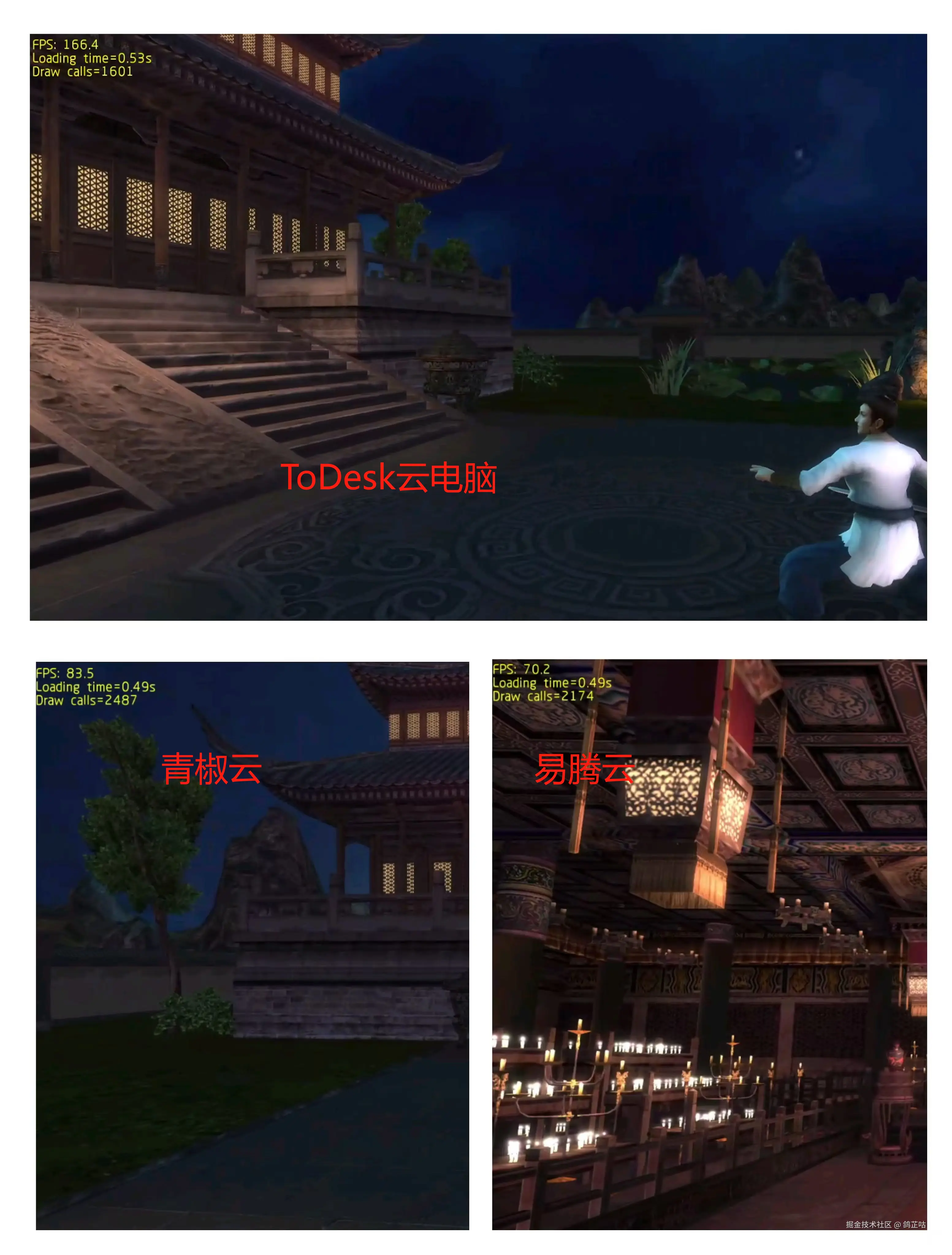这边进行测试下来,ToDesk云电脑进行鲁大师抗压测试中帧率达到了166Fps、易腾云则是在80Fps左右徘徊、青椒云这边实测起来只达到了70帧率保持