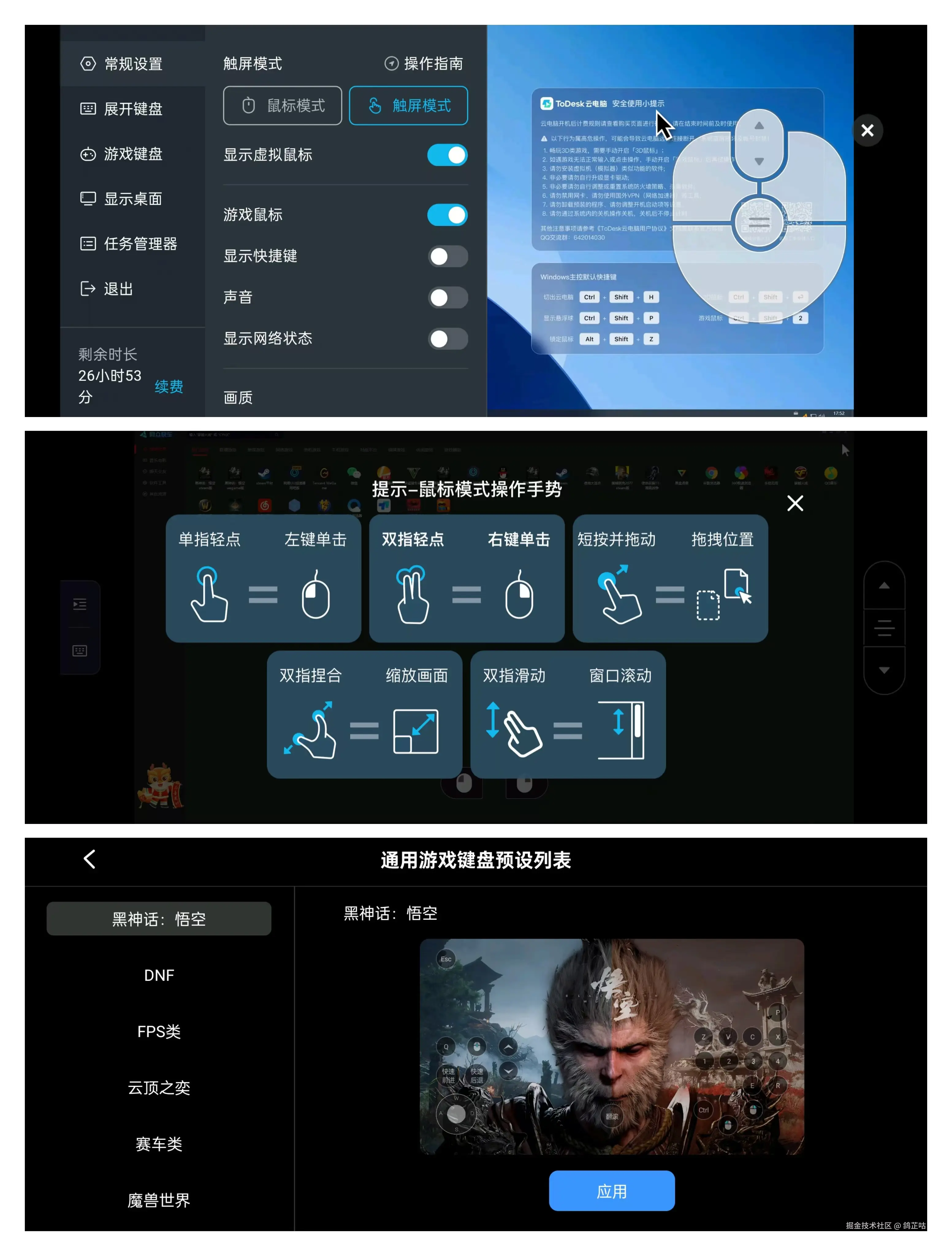 - ToDesk云电脑:在移动端的应用有完整的操作指引,在操作设置上可选择的功能最多,对于热门游戏黑神话悟空,还专门设置了官方按键。例如FPS类DNF等等