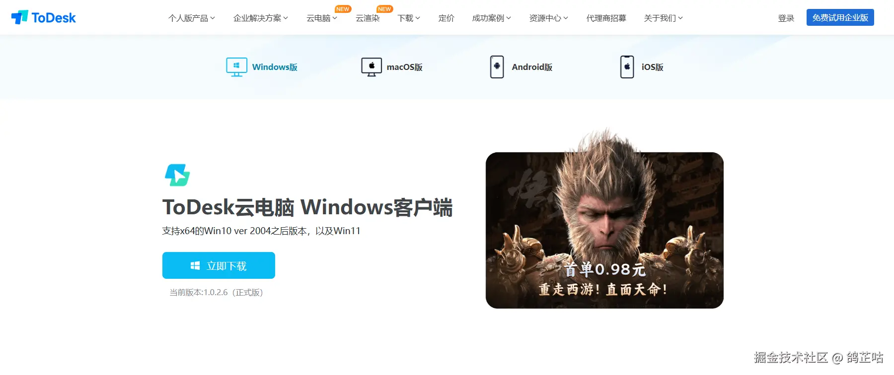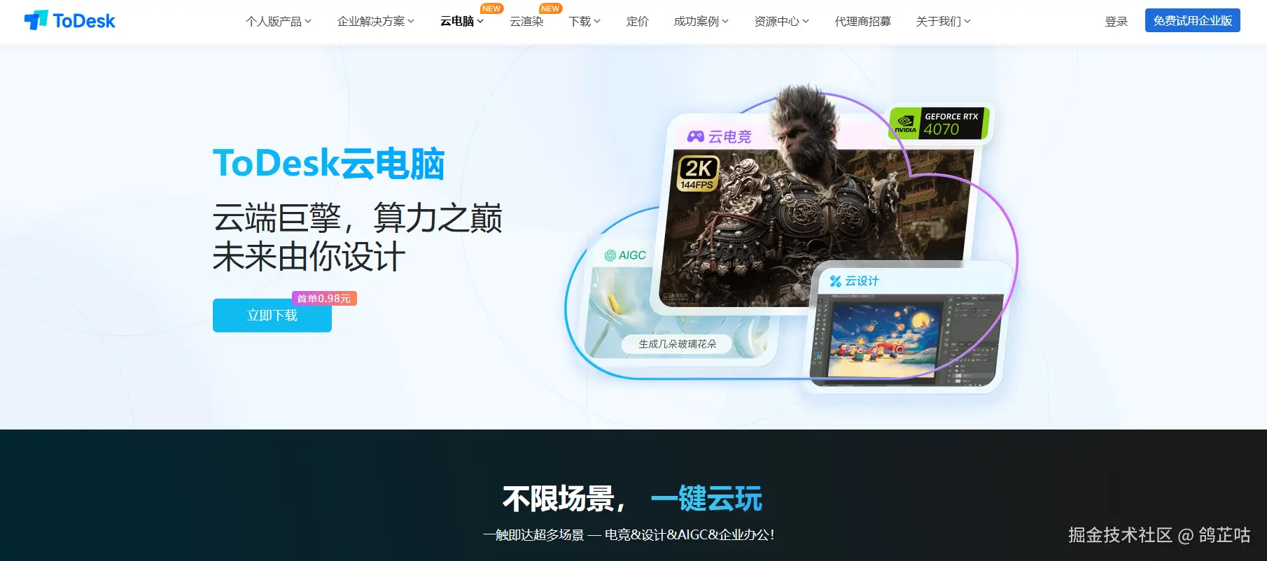 - ToDesk云电脑:新用户首单才0.98,还有各种优惠活动和多种选择的配置服务。