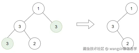 注意,一旦删除值为 target 的叶子节点,它的父节点就可能变成叶子节点;如果新叶子节点的值恰好也是 target ,那么这个节点也应该被删除。