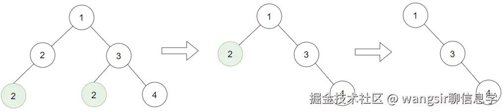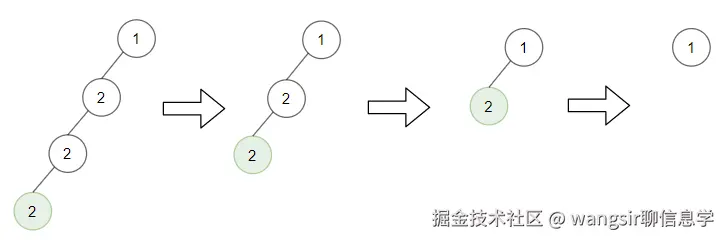 解释:每一步都删除一个绿色的叶子节点(值为 2)。