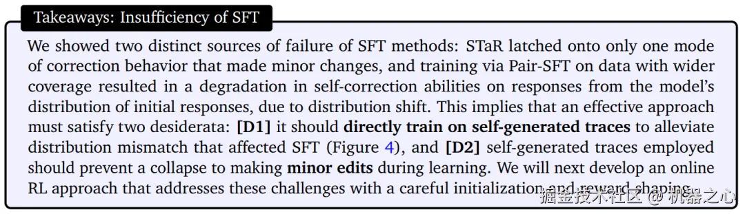 这里的 [D2] 如下图所示,图中展示了 SFT 方法失败的两个原因。而有效的解决方案必须满足两个要求:[D1] 模型应该直接在自生成轨迹上进行训练,以缓解 SFT 的分布不匹配(图 4),[D2] 所采用的自生成轨迹应防止在学习过程中因进行微小编辑而崩溃。