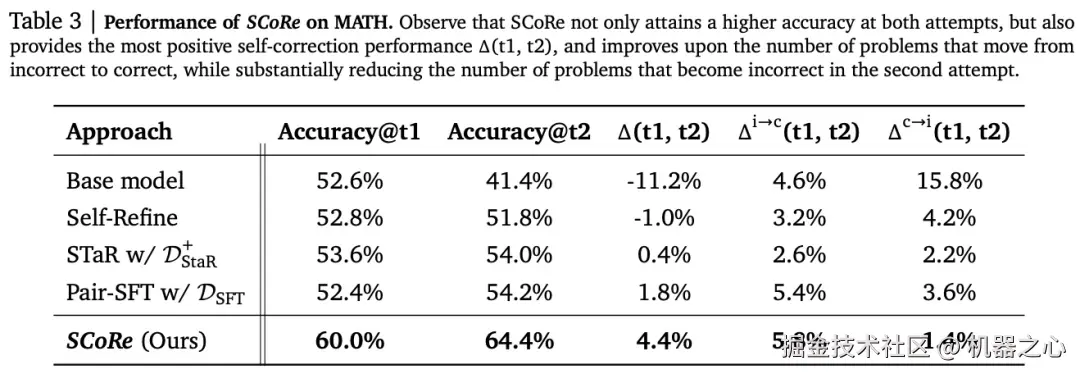 本文主要贡献在于提出了一种多轮强化学习方法 ——SCoRe,用于教 LLM 如何纠正自己的错误。相对于基础 Gemini 模型,SCoRe 在 MATH 推理问题的自我纠正方面获得了 15.6% 的增益,在 HumanEval 编码问题上获得了 9.1% 的增益。