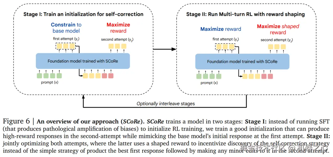 图 6 为阶段 I、阶段 II 流程说明。可以看出 SCoRe 以交错方式应用阶段 I 和 II 进行多次迭代。