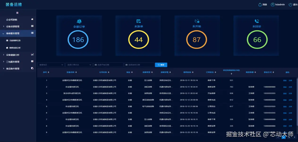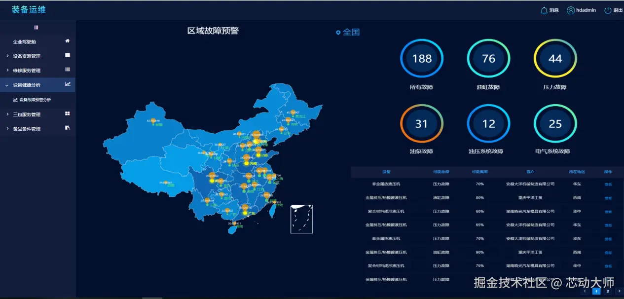 (1)企业驾驶舱:主要是服务于设备制造企业的管理者,方便了解平台数据情况与关键业务流程的指标,从整体界面上可以很方便的了解到设备的售卖情况,企业接入的信息,平台数据的采集情况。同时还可以对一些关键的业务流程,包括企业设备的监控、报警信息的展示、维修效率的管理、设备的故障情况和三包任务的信息进行追踪与管理。