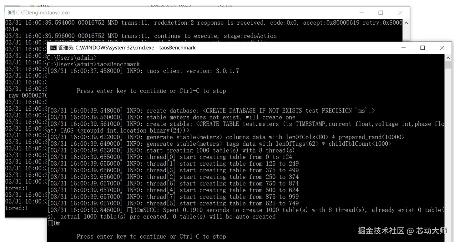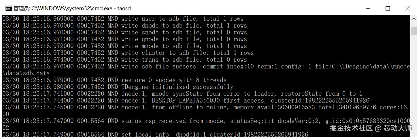 安装后,可以在拥有管理员权限的 cmd 窗口执行 sc start taosd 或在 C:\TDengine 目录下,运行 taosd.exe 来启动 TDengine 服务进程。