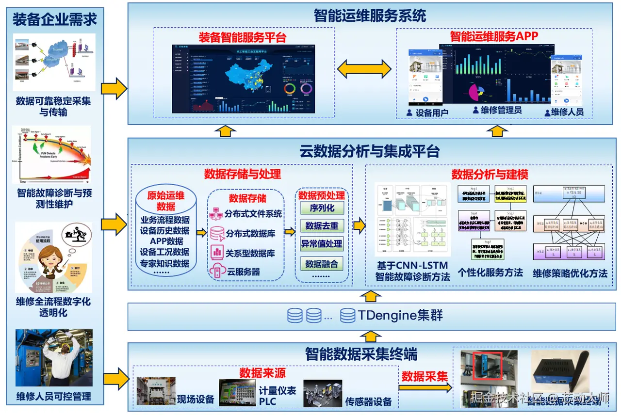 TDengine 与高端成形装备的智能数据采集终端模块相连,助力采集终端完成对设备运行数据的采集,为系统提供设备数据基础;工业云计算服务平台提供系统数据的存储、转换、分析等,为系统提供业务数据支持;智能运维服务系统由装备智能运维服务平台和智能运维服务 APP 组成,分别为企业人员提供系统和移动端的服务支持。