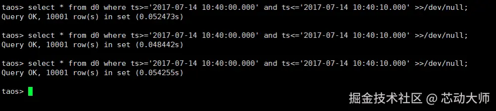 select * from d0 where ts >= ‘2017-07-14 10:40:00.000’ and ts <= ’2017-07-14 10:40:10.000’ >> /dev/null;
