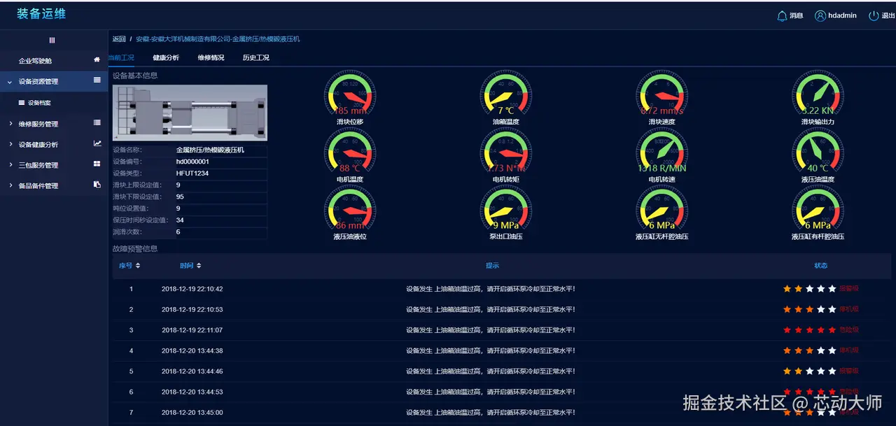 当前工况方便用户了解设备的基本信息、关键指标和报警情况,还能够提供设备当前情况的总览。