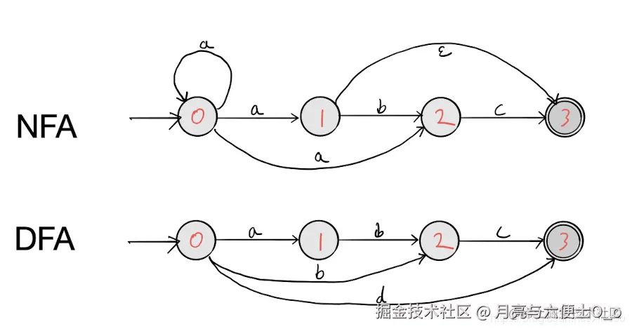 正则表达式引擎主要分为两种类型:非确定性有限状态自动机(NFA)和确定性有限状态自动机(DFA)。