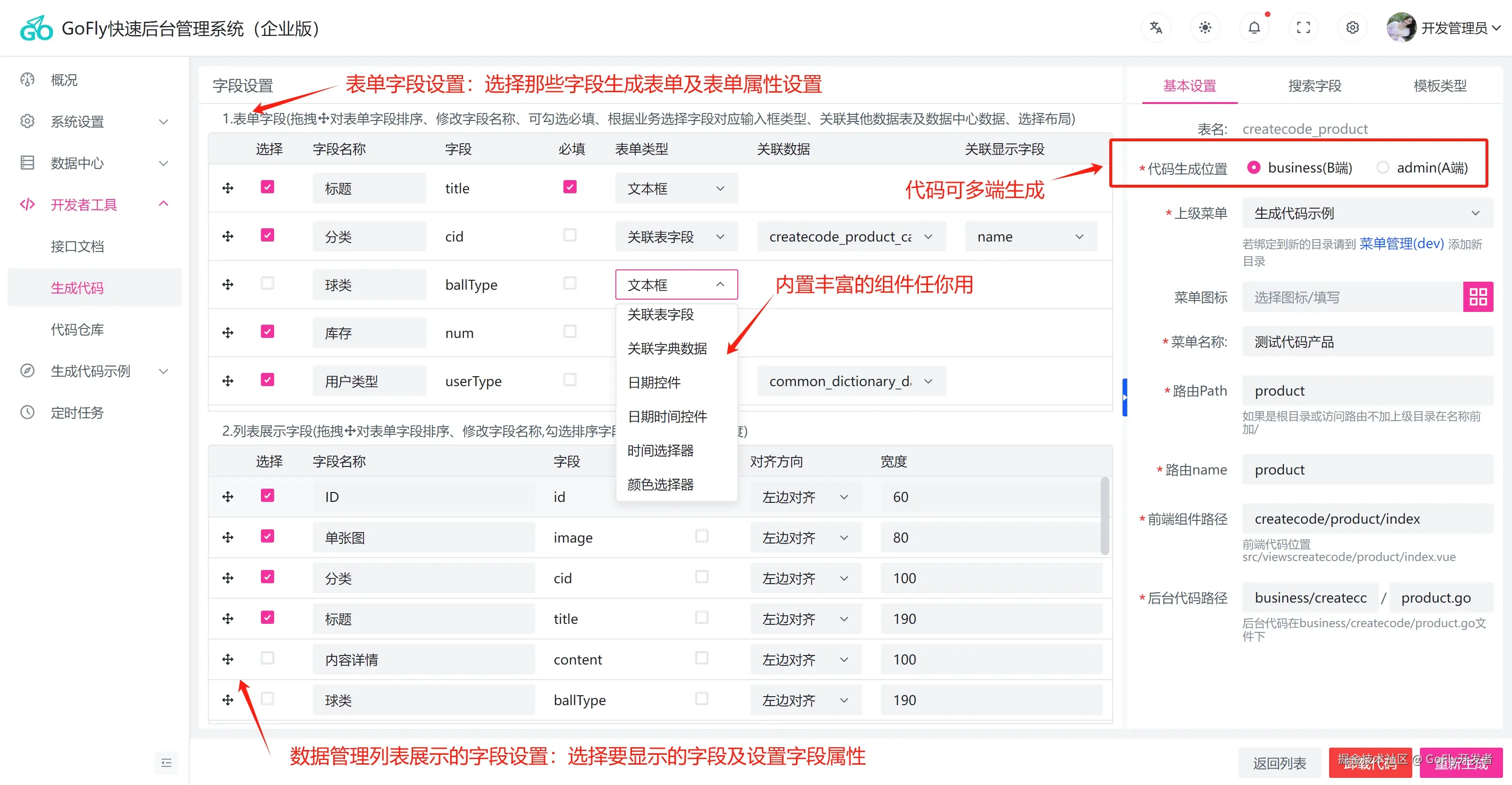代码生成工具可生产组件丰富前端代码,满足所有常见表单组件和列表显示组件。