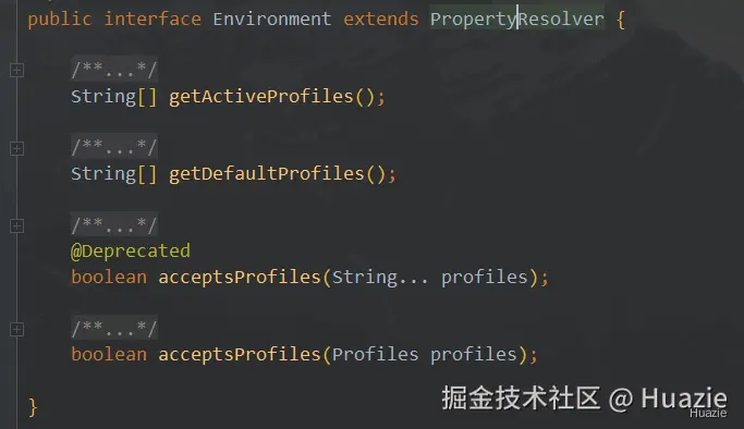 此外,Environment 接口还继承了 PropertyResolver 接口【用于根据任何底层源解析属性的接口】,这意味着它还提供了与属性访问相关的功能。