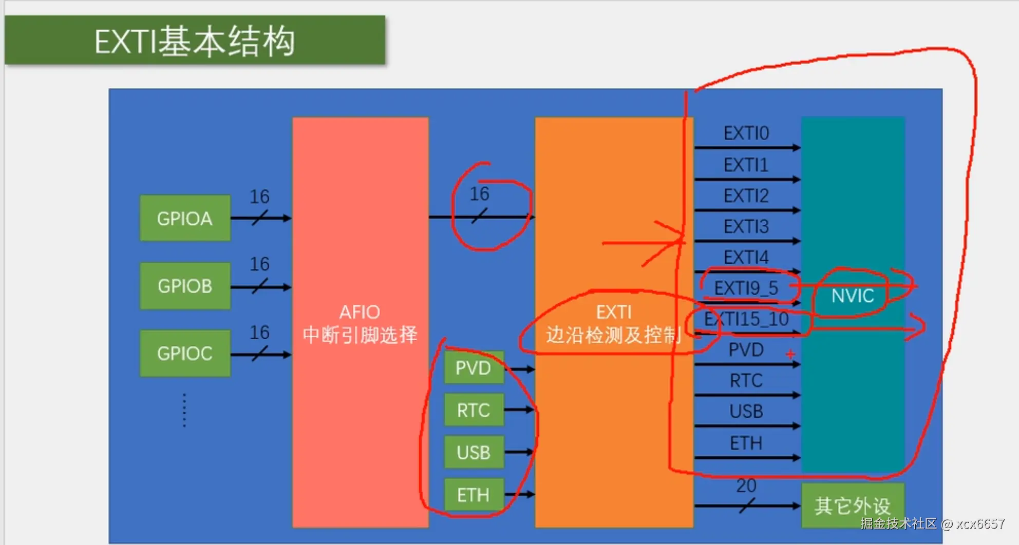 - 这里注意一下,本来20路输入,应该有20路中断的输出,但是可能ST公司觉得这20个输出太多了,比较占用NVIC的通道资源,所以就把其中外部中断的 9~5 和15 ~ 10给分到一个通道里。也就是说,外部中断的9~5会触发同一个中断函数,15~10也会触发同一个中断函数,在编程的时候,我们在这两个中断函数里,需要再根据标志位来区分到底是哪个中断进来的。