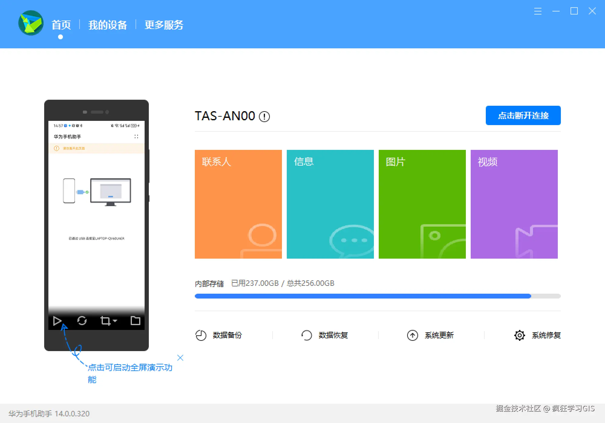如下图所示。这里如果我们是基于华为手机助手软件,将手机与电脑连接的话,那么不仅可以操作手机中的照片、视频,还可以在电脑查看手机的联系人、信息等数据;同时还可以在电脑中实时查看、操作手机屏幕(但有延迟)。