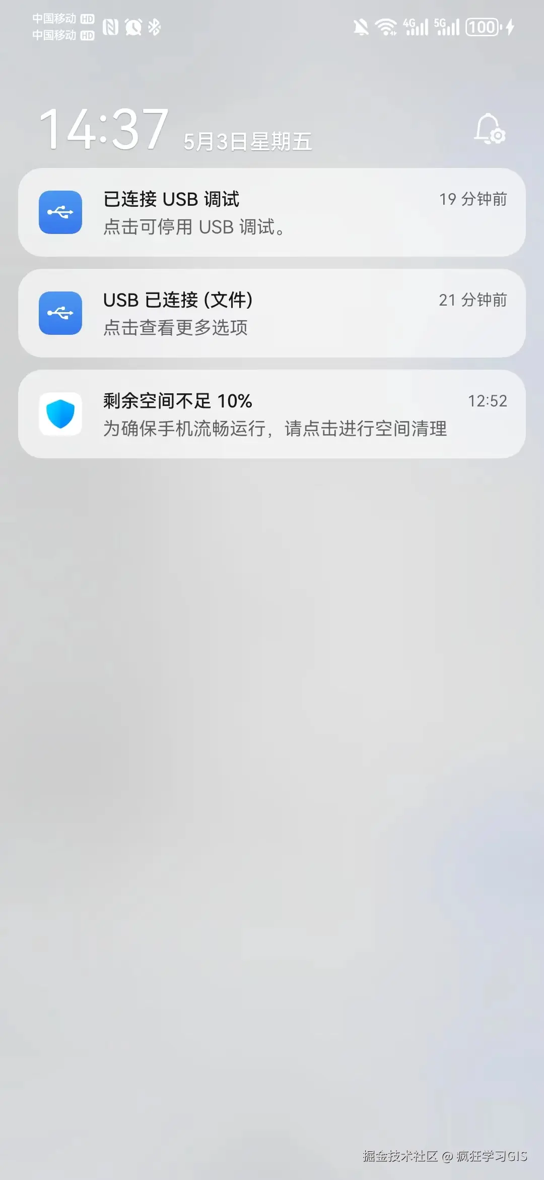 但此时,手机上却可以出现“USB已连接”的提示,且我这里因为手机上开启了USB调试功能,所以也出现了“已连接USB调试”的提示,如下图所示。这就表明,至少USB线、电脑USB接口是没有问题的——因为手机出现这2个提示,就说明其已检测到自身在和电脑连接了。
