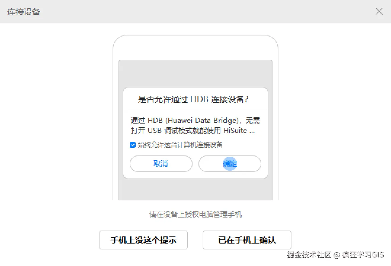 此外,如果是第一次通过华为手机助手软件将华为手机与电脑连接,则还需要在手机端也下载一个华为手机助手APP,如下图所示。