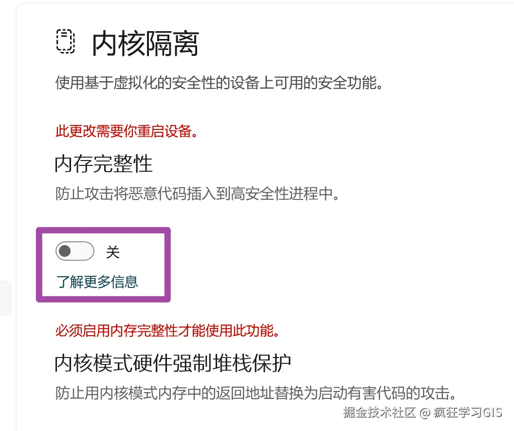 接下来,将“内核隔离”下方的勾选项取消,即设置为“关”;设置后如下图所示。