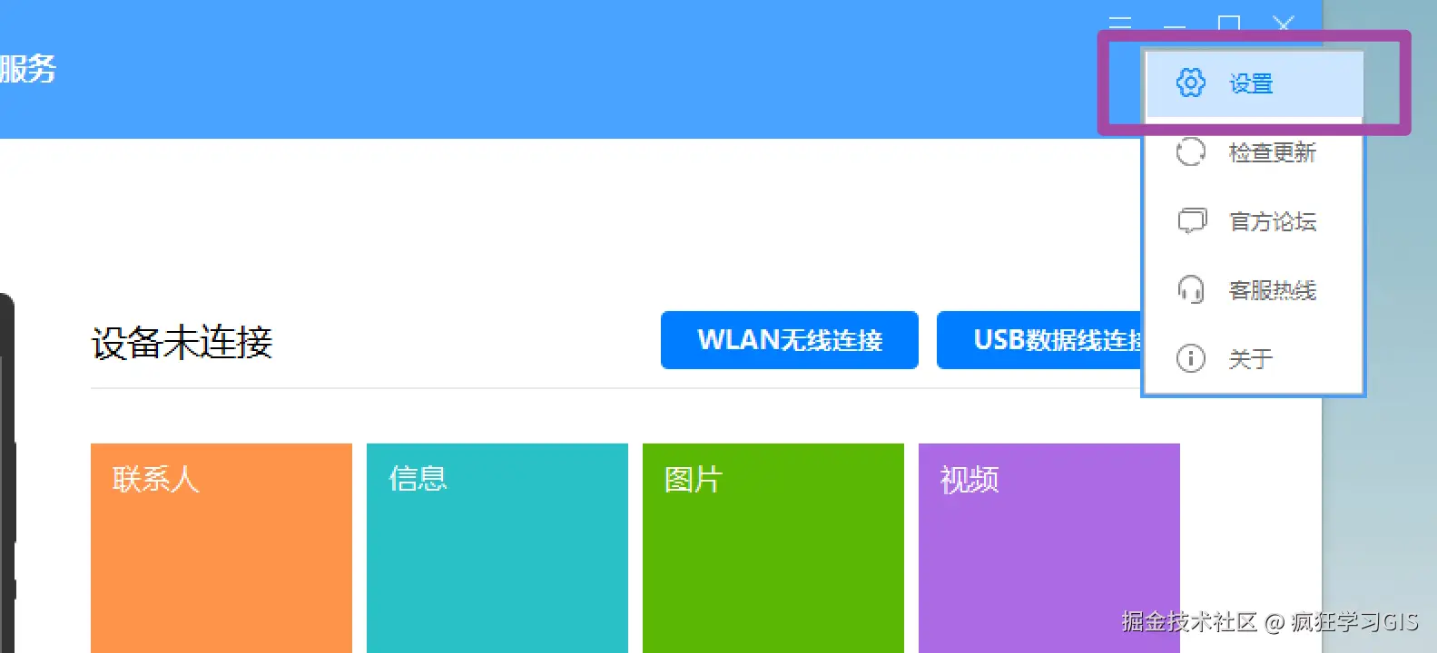 首先,在华为手机助手软件右上角,点击其最左侧的按钮,并选择“设置”;如下图所示。