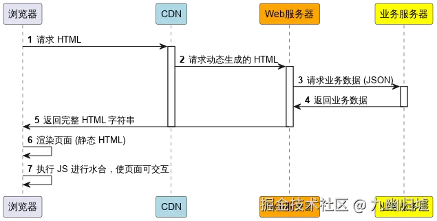 在 SSR 模式中,Web 服务器预先生成完整的 HTML 字符串,并将页面的初始状态返回给浏览器。浏览器加载完 JS 后,会对页面进行水合(hydration),使其变为可交互状态。