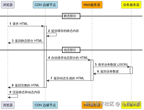 在 ESR 模式中,CDN 不仅缓存静态资源,还可以在边缘节点执行部分动态逻辑,结合静态与动态渲染。静态内容直接从 CDN 提供,动态内容通过边缘节点请求业务服务器来渲染。