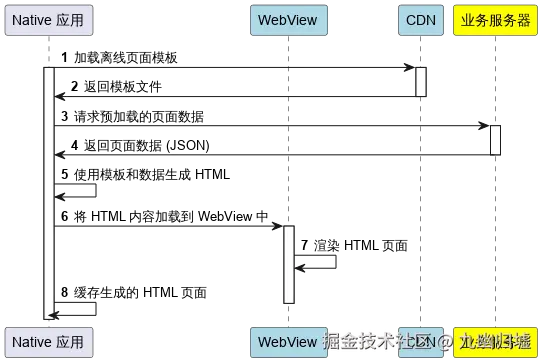 NSR 模式下,Native 应用通过加载离线页面模板和预加载页面数据,使用 WebView 渲染生成的 HTML 页面,并将其缓存在客户端。该模式强调在客户端进行渲染,以提升性能和用户体验。