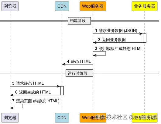 SSG 模式下,Web 服务器在构建时通过业务服务器获取数据,并提前生成静态 HTML。生成的 HTML 被缓存到 CDN 上,用户请求时直接获取静态页面,无需业务服务器的参与。