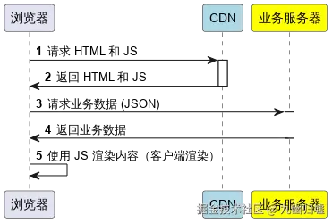 CSR 模式下,浏览器向 CDN 请求静态 HTML 和 JS,JS 负责获取业务服务器数据并在浏览器中渲染页面。