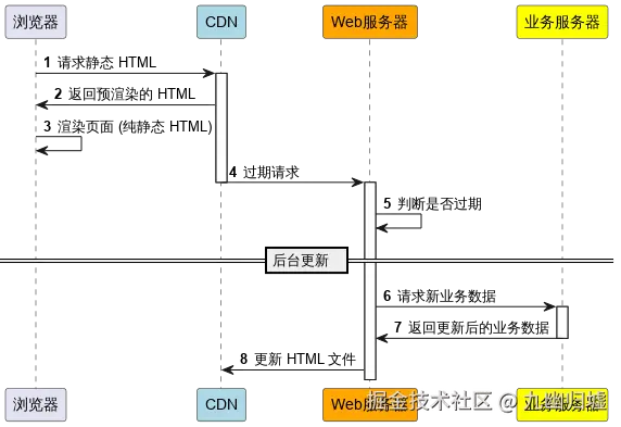 ISR 模式结合了 SSG 的静态页面生成和 SSR 的动态更新能力。初次加载时,静态 HTML 会被提供给用户,这种场景下静态 HTML 有可能是过期的,但 Web 服务器会在后台请求业务数据,增量更新 HTML。