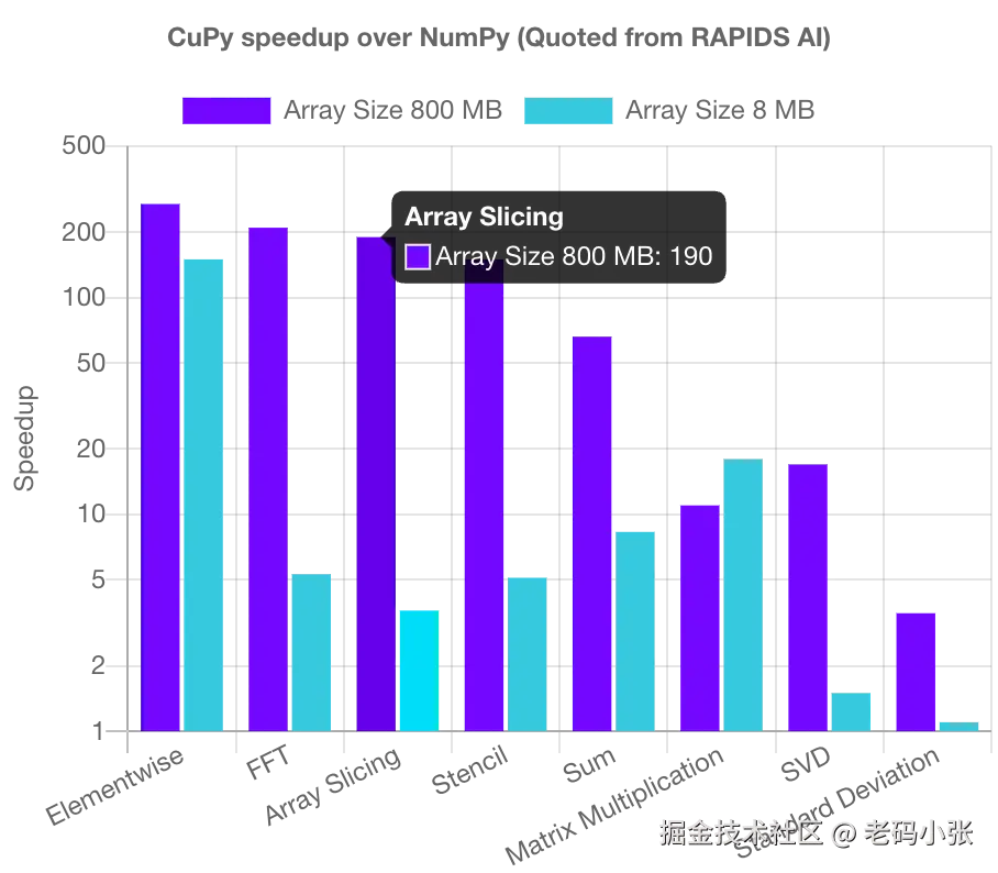 简单来说,CuPy就是一个与NumPy API高度兼容的库,专门用来把你平常在CPU上运行的NumPy运算转移到GPU上运行。你可以把CuPy想象成NumPy的一个“进阶版”,它会在你平常的代码里加上“Turbo模式”,利用GPU强大的并行计算能力,直接提速。