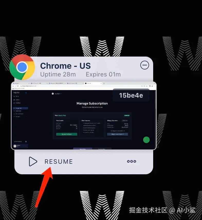 如果重新登录遇到 Kasm Limit Exceeded For User 这类错误,不用担心,点击左边已经运行的 Session,点击 「Resume」即可恢复原来打开的窗口 。
