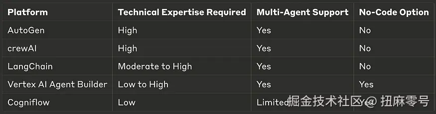 - 技术专长:评估团队的 AI 和编码熟练程度。Cogniflow 和 Vertex AI Agent Builder 等平台提供无代码选项,而 AutoGen 和 LangChain 可能需要更多的技术专业知识。