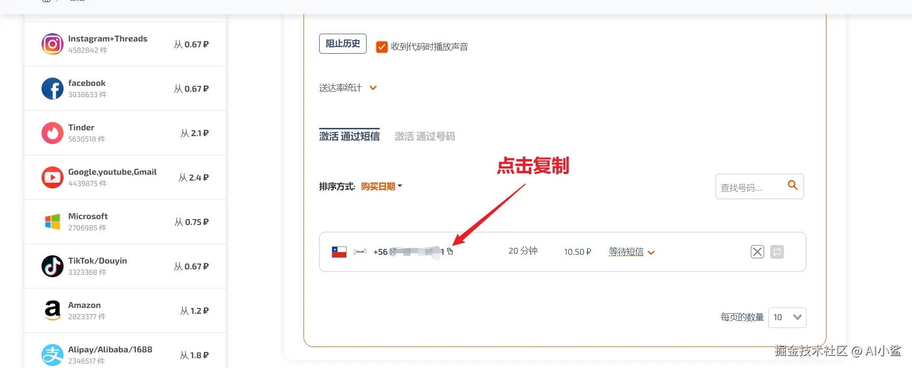 购买后跳出界面,复制购买的虚拟手机号。