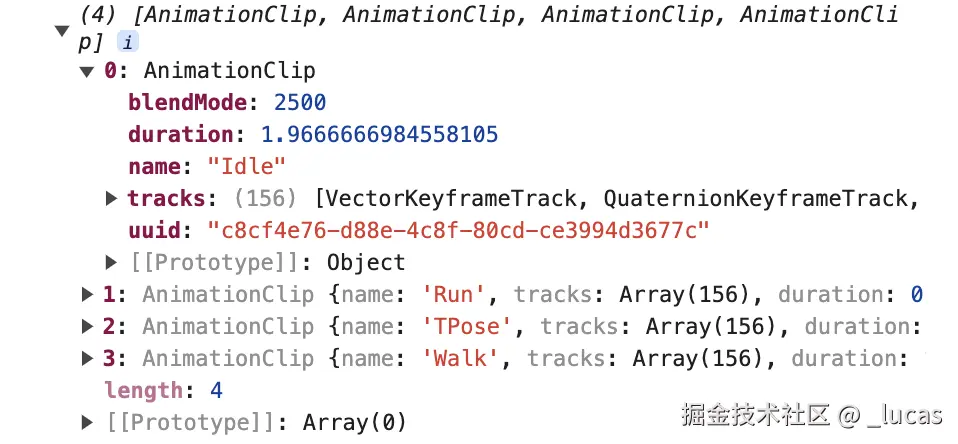 可以看到,这里总共包含了四个动画片段,TPose 那个大家有兴趣的话可以实践下看看是啥动作 ~ 这里基本上跟之前讲的一样,层级结构从上至下就是动画片段、帧轨迹、关键帧。那怎么把这个动画片段播放出来,这里就需要借助 THREE.AnimationMixer,传入模型后,配合 clipAction可以做对应模型一个或多个动画片段的播放控制