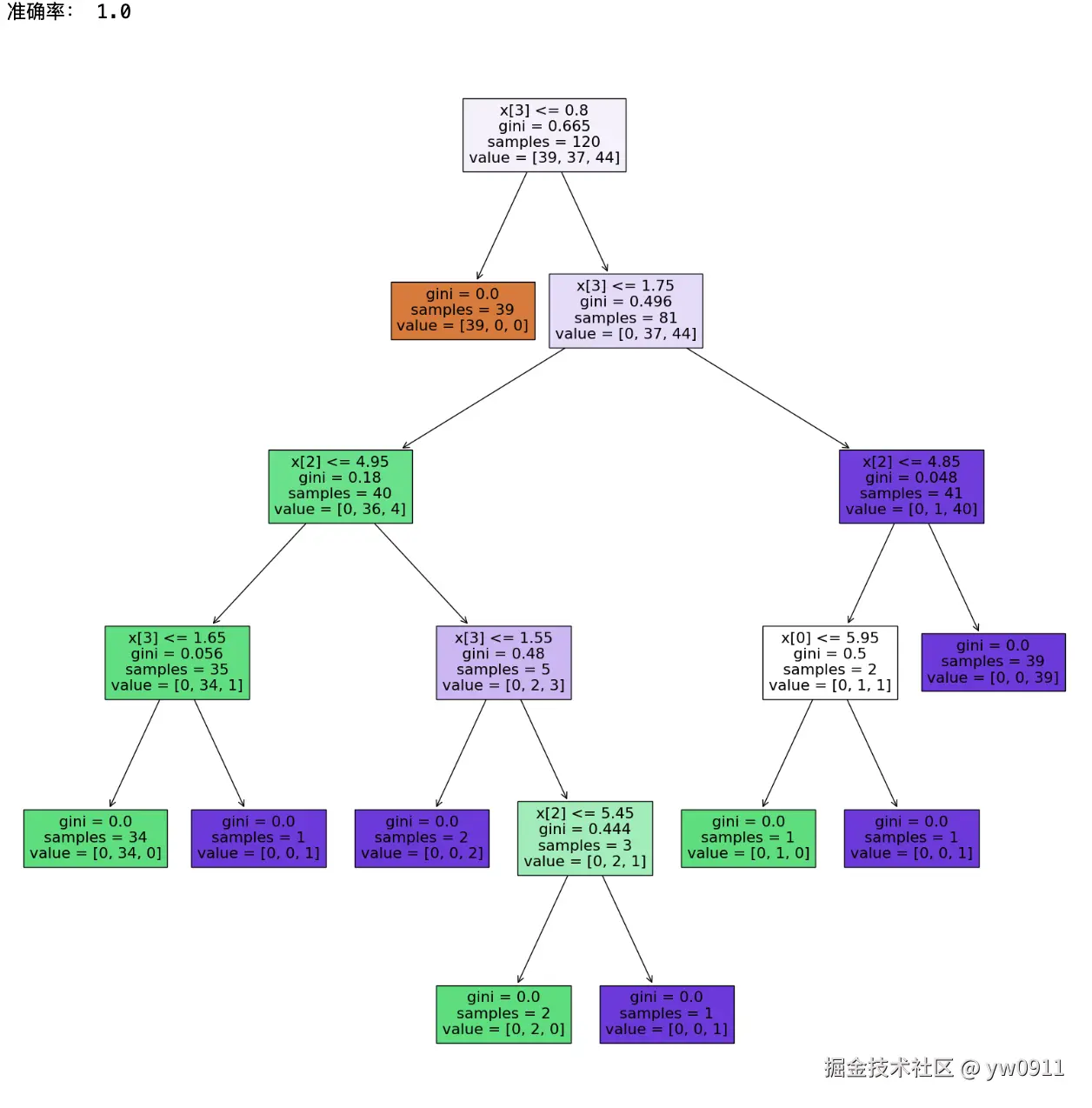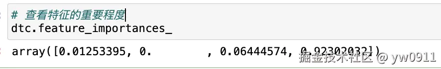 例如:通过鸢尾花分类问题对比发现,在决策树计算过程中,通过dtc.feature_importances_可以看到特征1的重要性为0,基本上没有什么作用;而特征3比较重要。
