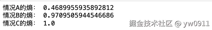 由上计算可知,C:[0.5, 0.5]的输出越不确定(一半概率输出第一种结果,一半输出第二种结果),所以其越混乱熵越大。