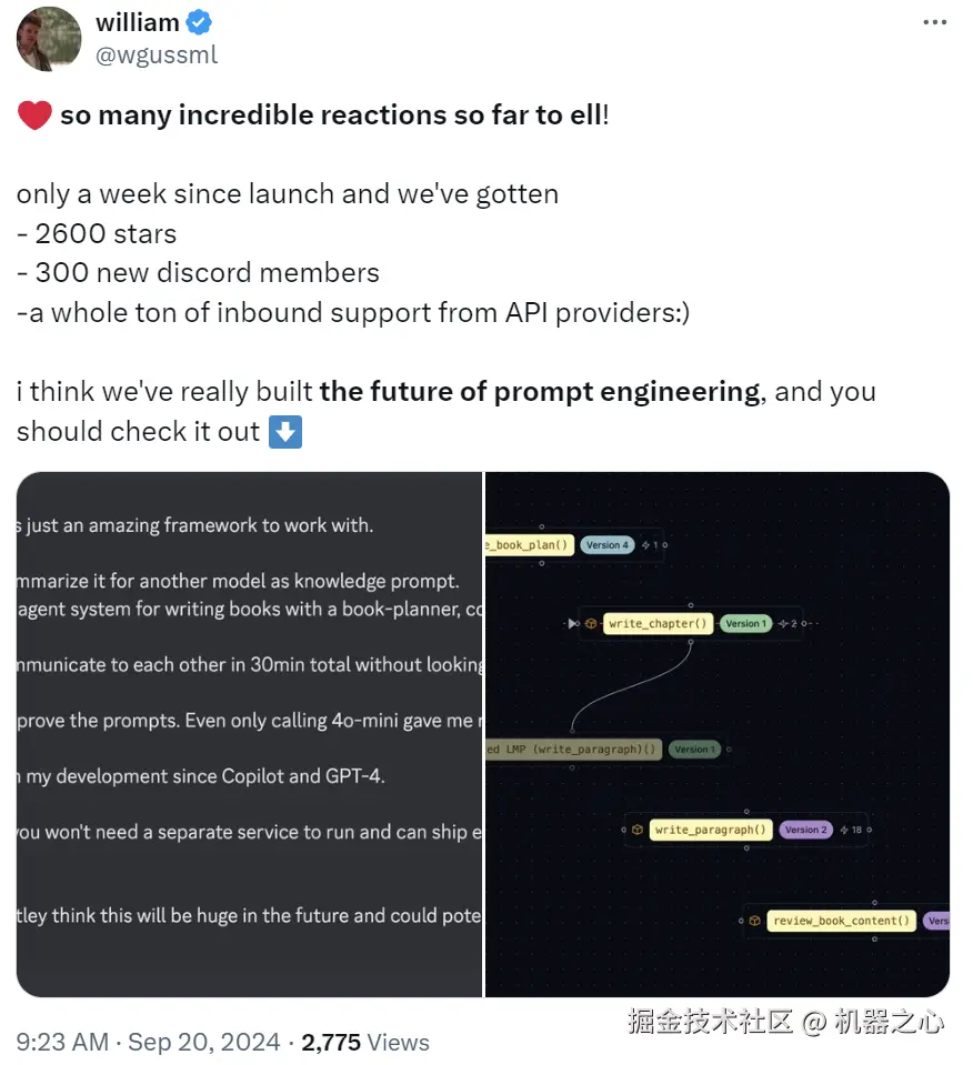 刚不久前,Huss 宣布发布了一款自称是「提示词工程的未来」工具 ell。具体来说,ell 是一款轻量级的函数式语言模型编程软件库,其优势包括自动化的版本控制和跟踪、丰富的本地开源视觉化工具、原生支持多模态数据。