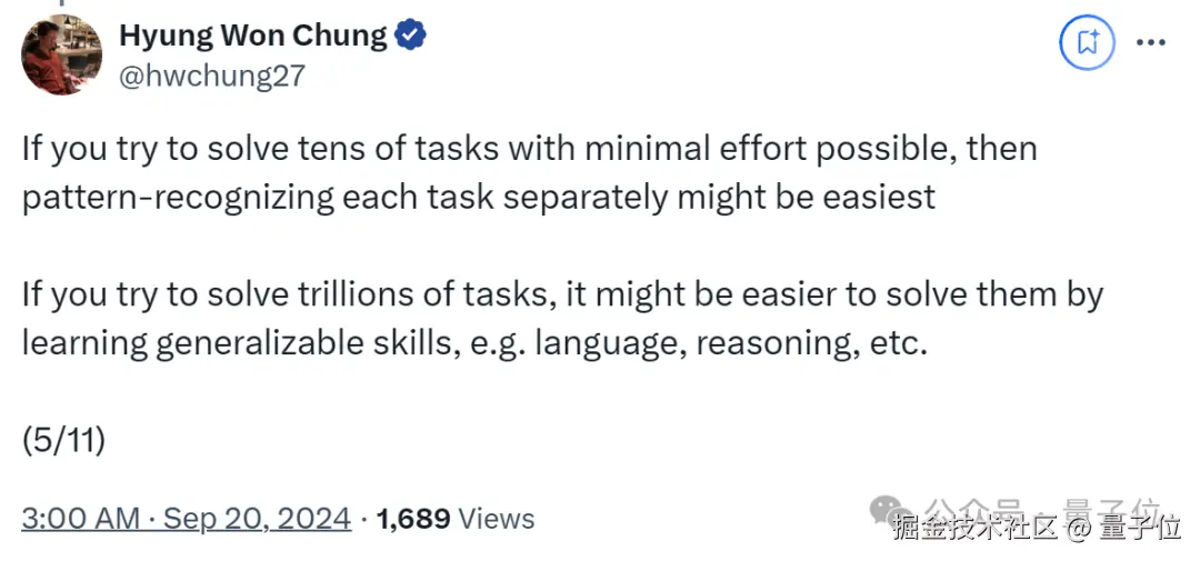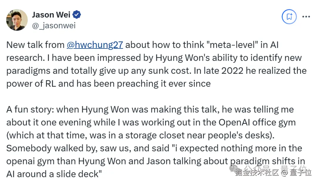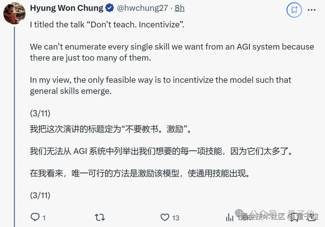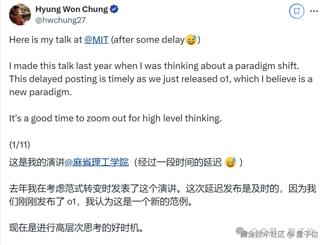 其中关键,OpenAI 研究科学家、o1 核心贡献者 Hyung Won Chung,刚刚就此分享了他在 MIT 的一次演讲。