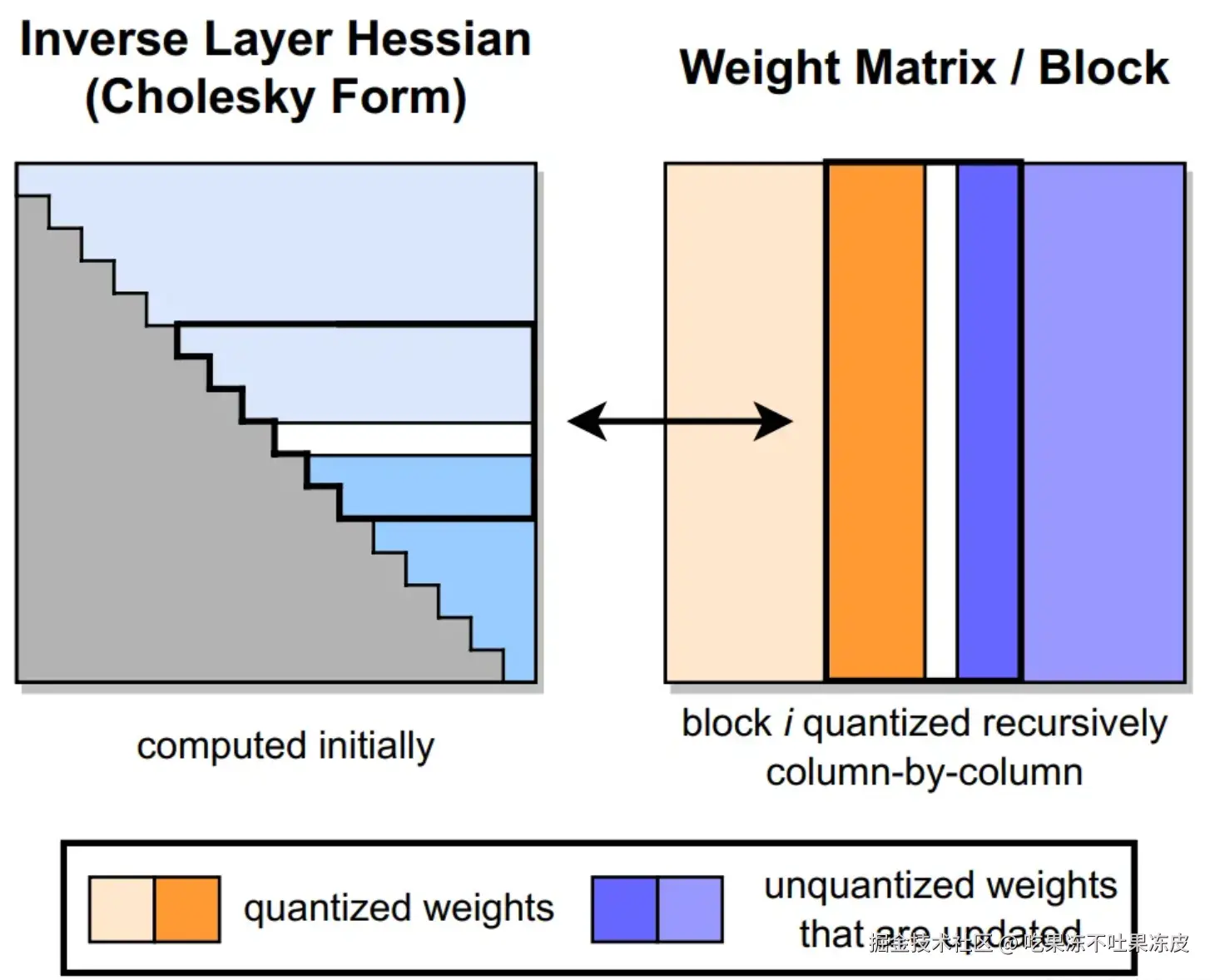 GPTQ 量化过程如下图所示。首先,使用 Cholesky 分解求解 Hessian 矩阵的逆,然后在给定的步骤中对连续列的块(粗体)进行量化,并在该步骤结束时更新剩余的权重(蓝色)。量化过程在每个块内递归应用,白色中间列表示当前正在被量化。