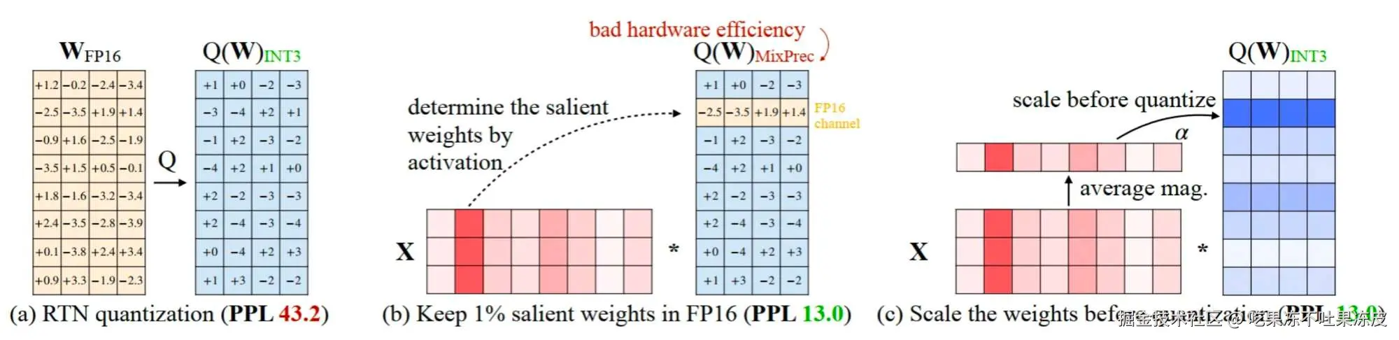 具体如下图所示,左边的(a)使用RTN量化误差较大,中间的(b)通过保留1%的重要权重不量化,量化误差明显降低。但是该方法采用混合精度计算并不是硬件高效的方式。右边则是使用AWQ进行激活感知的仅权重(即W4A16)量化方法,通过逐通道缩放以保护显著权重来减少量化误差,这种方法不存在硬件效率低下的问题。