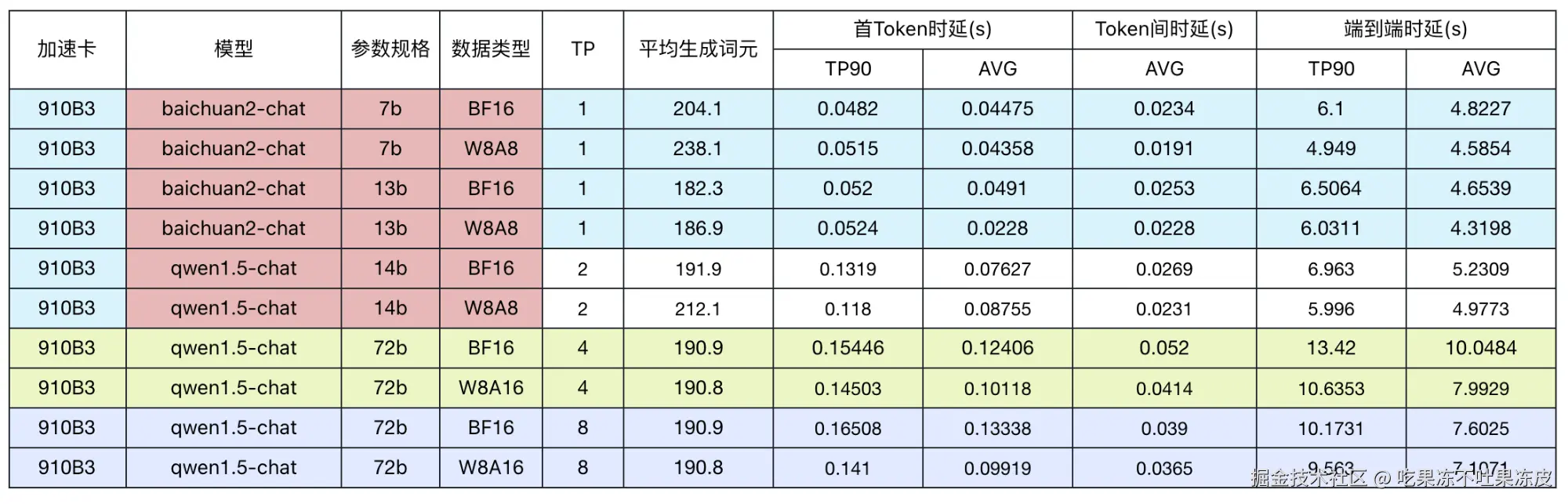 对 baichuan2 和 qwen1.5 进行量化和使用 MindIE Service 进行服务化之后。对其进行推理性能测试,具体如下表所示: