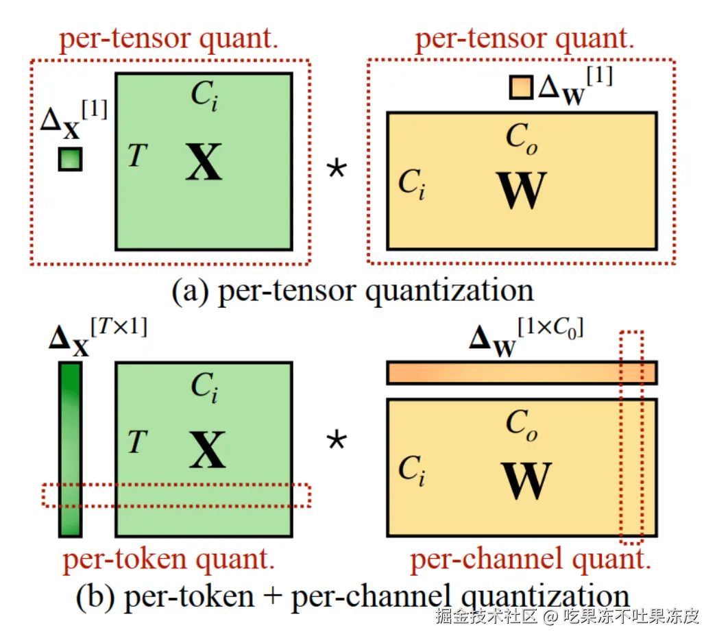 为了进行 vector-wise quantization 以有效利用 INT8 GEMM 内核,我们只能使用外部维度(即激活的维度 T 和 权重的维度 )的缩放因子,不能使用内部维度(即通道内维度 )。因此,先前的工作对激活都采用了per-token量化,但并不能降低激活的难度。