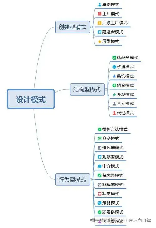 (3)行为型模式,共11种:策略模式、模板方法模式、观察者模式、迭代子模式、责任链模式、命令模式、备忘录模式、状态模式、访问者模式、中介者模式、解释器模式。