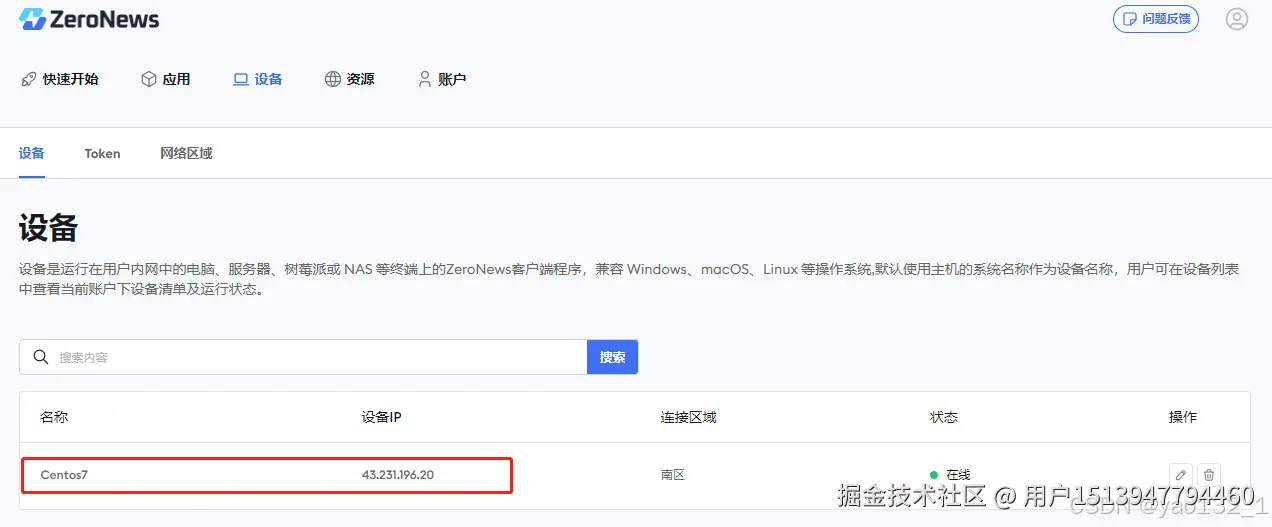 ZeroNews启动完成后,在ZeroNews 平台的 "设备" - “设备” 菜单下,可以查看已上线的 centos zeronews 程序